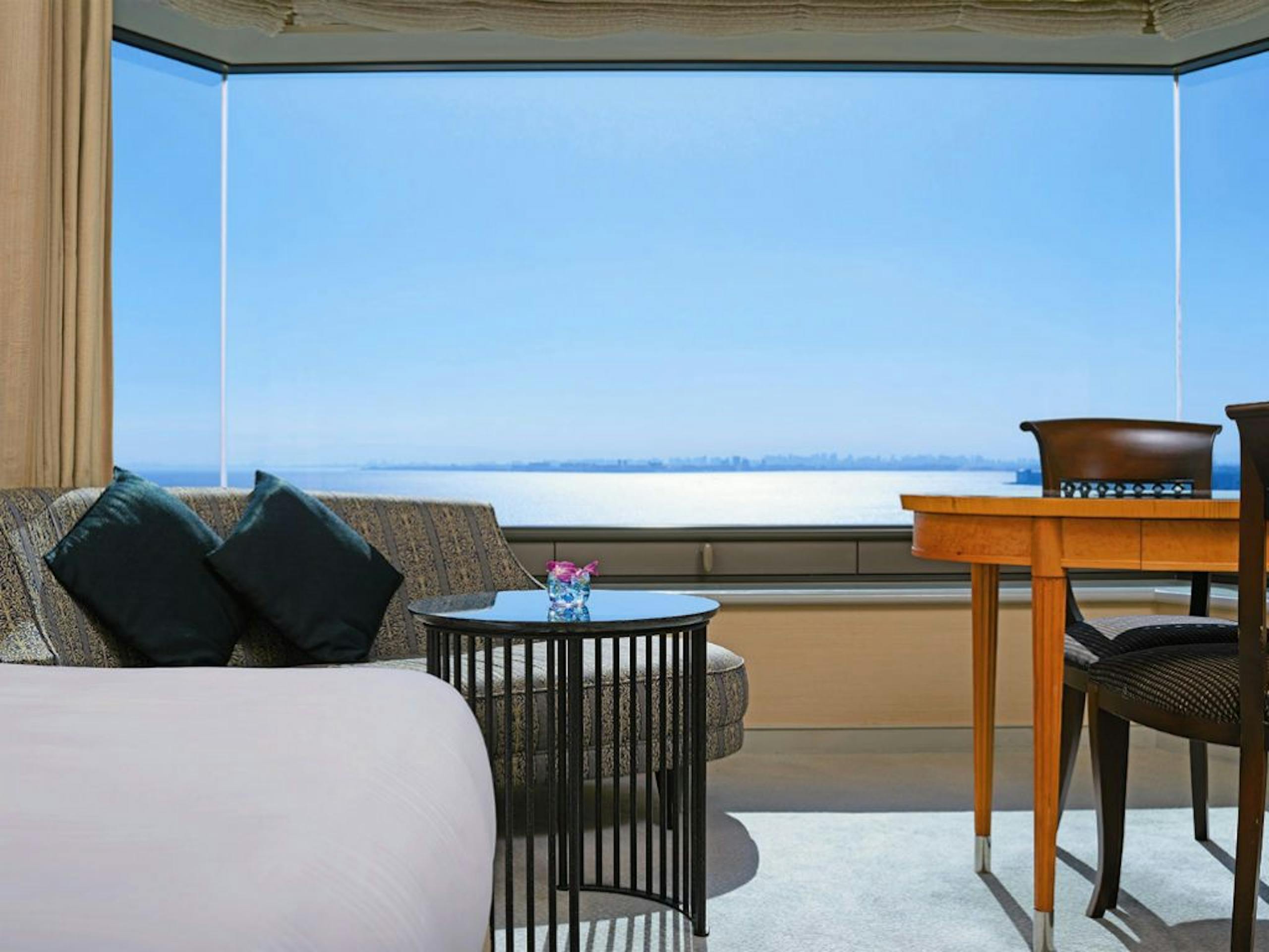横浜港が目の前にありホテルからの景色は素晴らしく、高層階からの眺めはお勧めです。